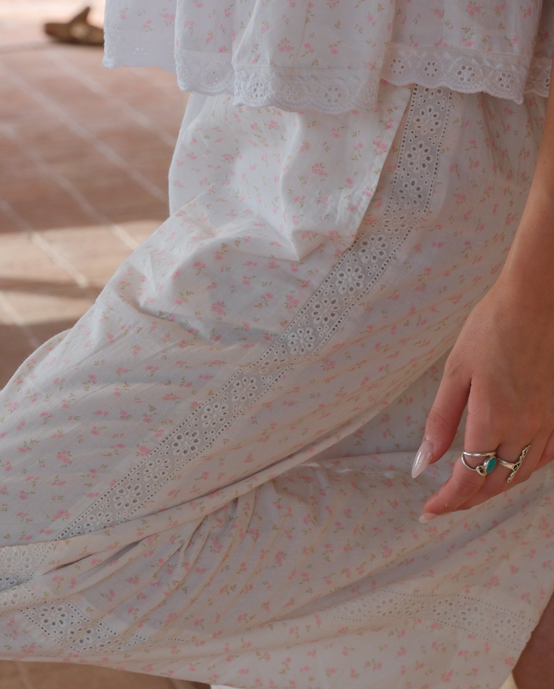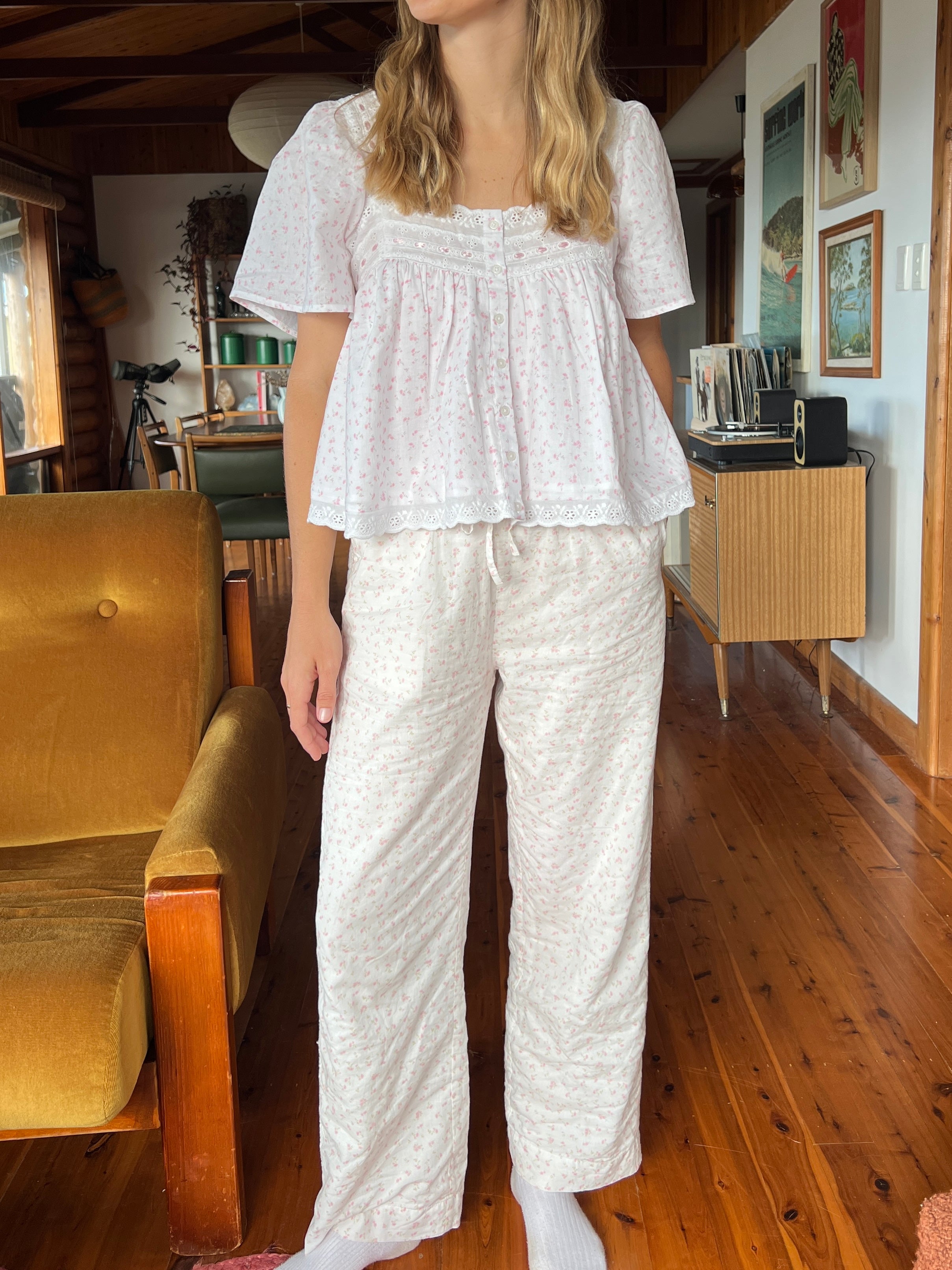 This vintage-inspired piece features delicate lace and ribbon trims, floaty loose sleeves, and a relaxed, comfortable silhouette.