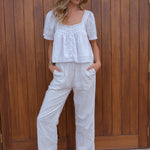 Introducing our Harper Lace Pants- Our signature Harper pants have been elevated with a delicate cotton lace trim along the side seam.