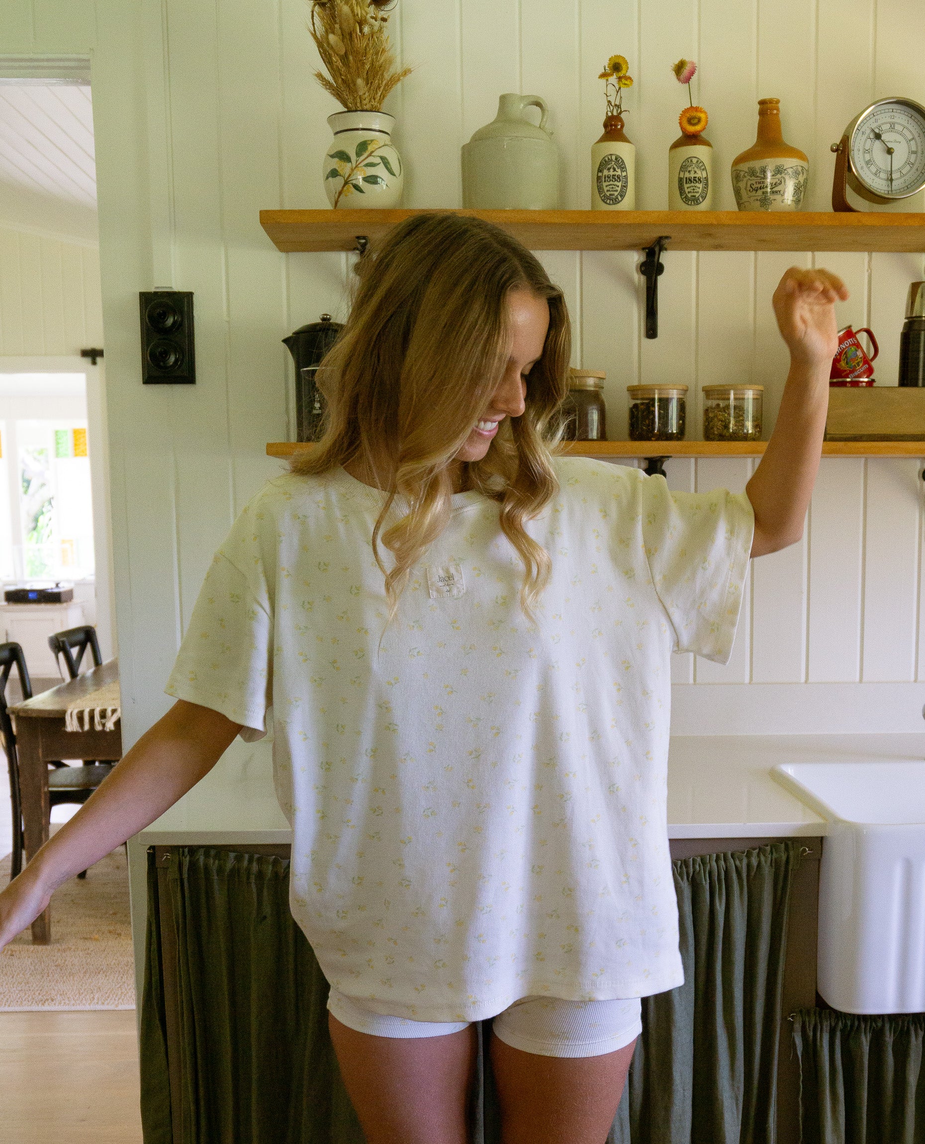 The Lottie Tee is designed to be an oversized, relaxed boxy fit, perfect for pairing with the matching Lotti bike shorts.